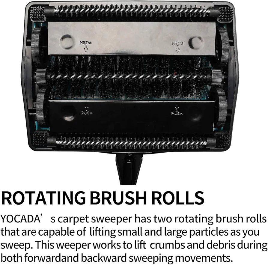 Features a dual rotating brush system for effective debris pickup, along with an independent single brush for scrubbing hair on the sweeper.