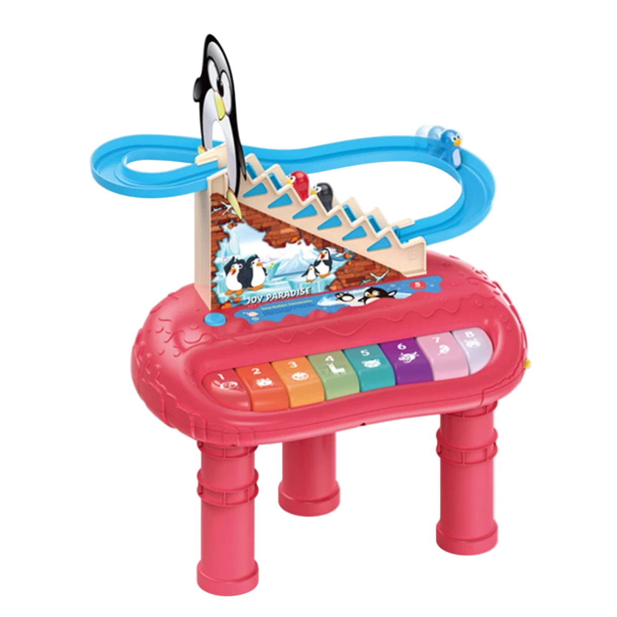 The little penguin models climb up and down the stairs continuously. Kids will love it because of its wonderful music and it comes in