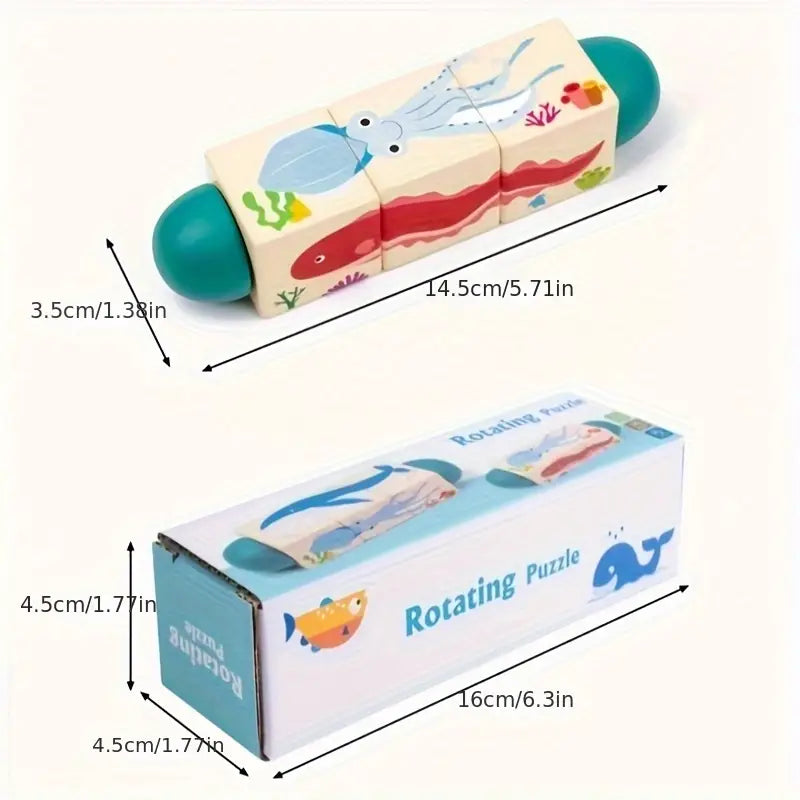 This educational wooden rotating puzzle toy is a fun puzzle for children that combines learning, development, and play. Bright pictures of sea creatures (whale, octopus, fish) help your child learn about animals and develop their attention span.